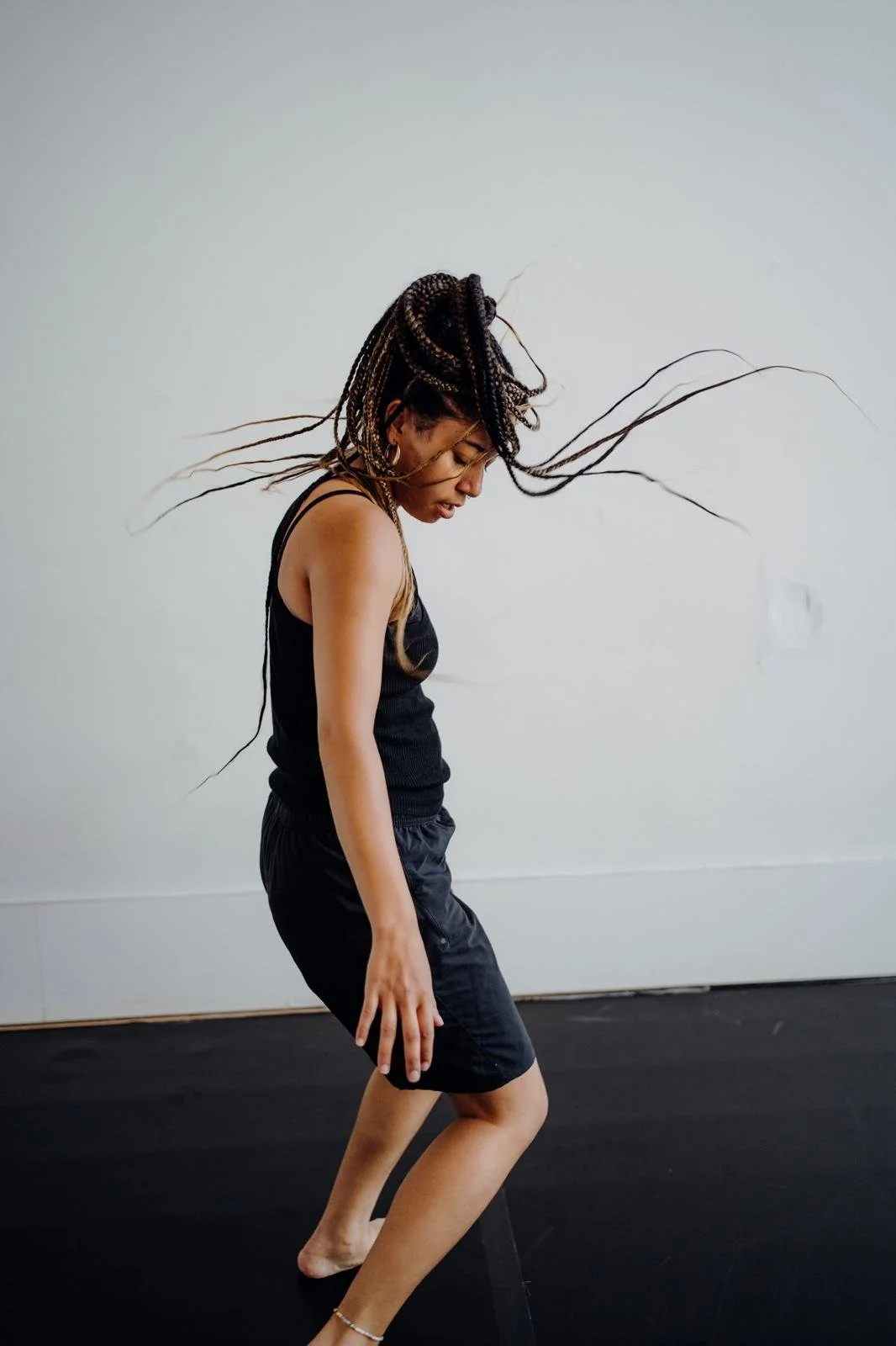 Mali, a slim mixed race woman in her early 20s, with long braids tied in a ponytail. She is wearing a black vest and black shorts. The background is a white wall. Mali is captured in the motion of swinging her torso upright from a forward fold. Her long braids fly out in an arc over her head. Her mouth is open and her gaze down.
